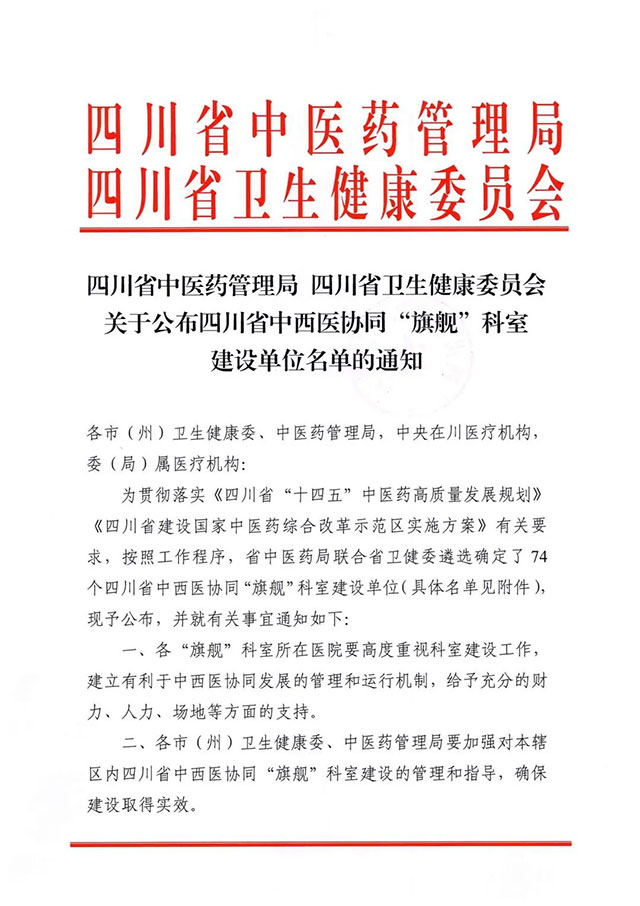 近日,四川省中医药管理局与四川省卫生健康委员会联合印发了《关于公布四川省中西医协同“旗舰”科室建设单位名单的通知》,泸州...