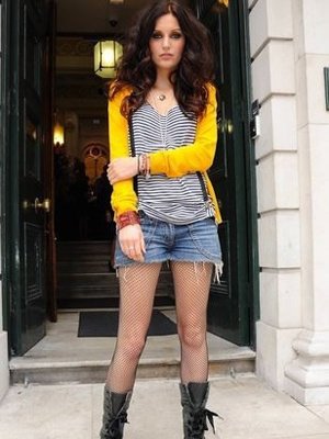 做旧短裤搭配网眼丝袜,搭配高帮军靴,性感之中透露丝丝野性的味道。小烟熏的妆容搭配凌乱的长发,惹火异常。